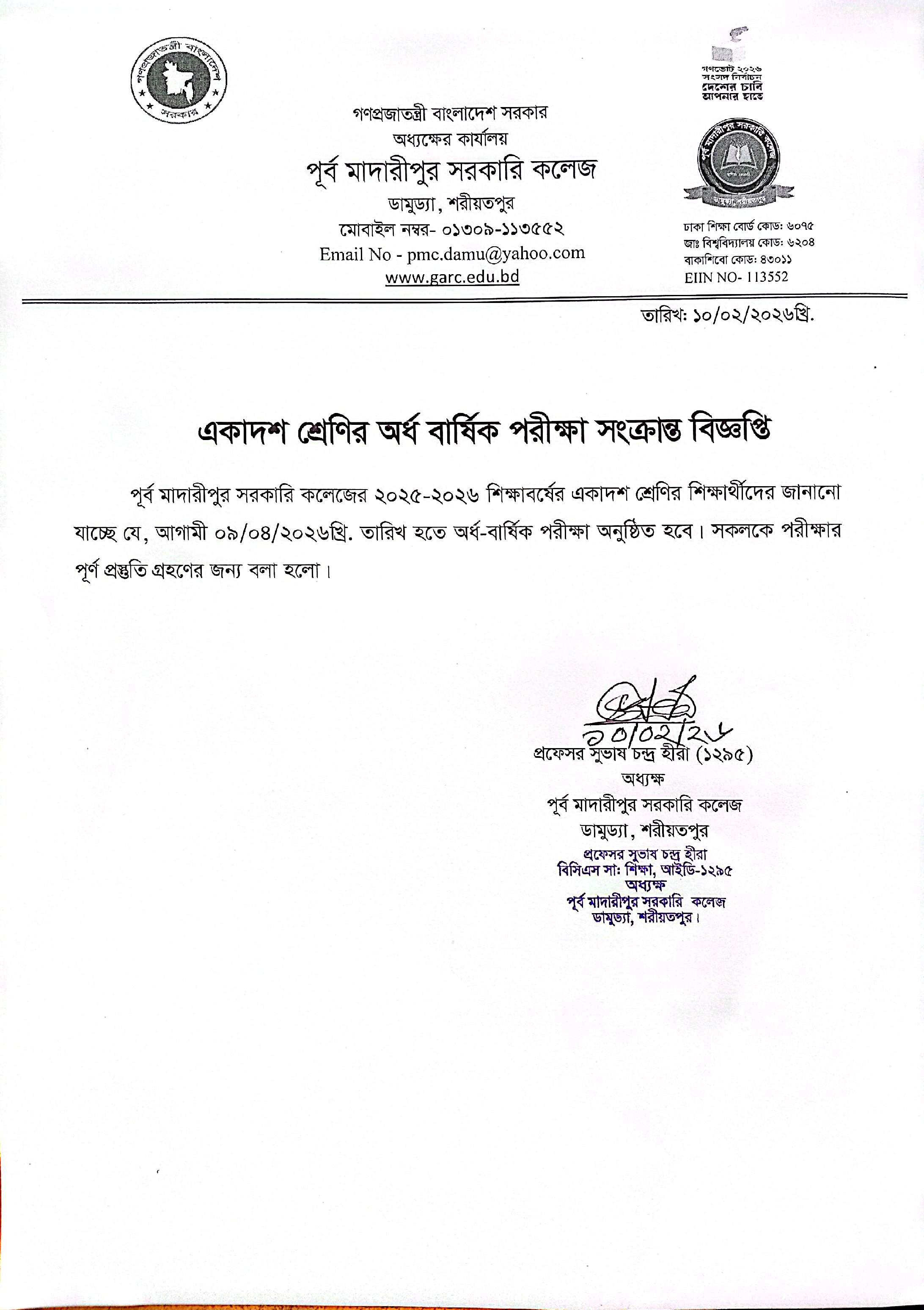 একাদশ শ্রেণির অর্ধ বার্ষিক পরীক্ষা সংক্রান্ত বিজ্ঞপ্তি.....