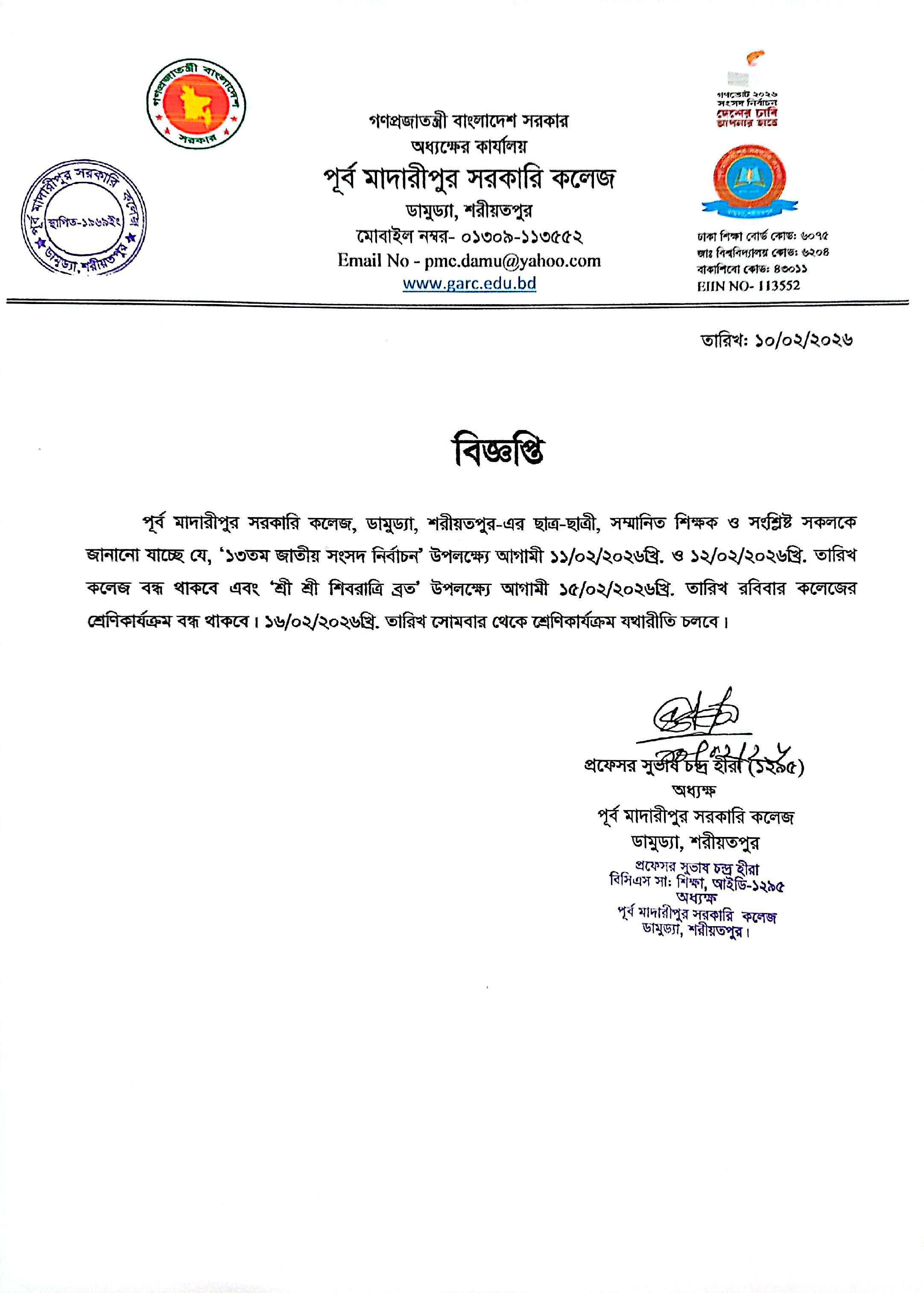 কলেজ বন্ধের বিজ্ঞপ্তি।.....