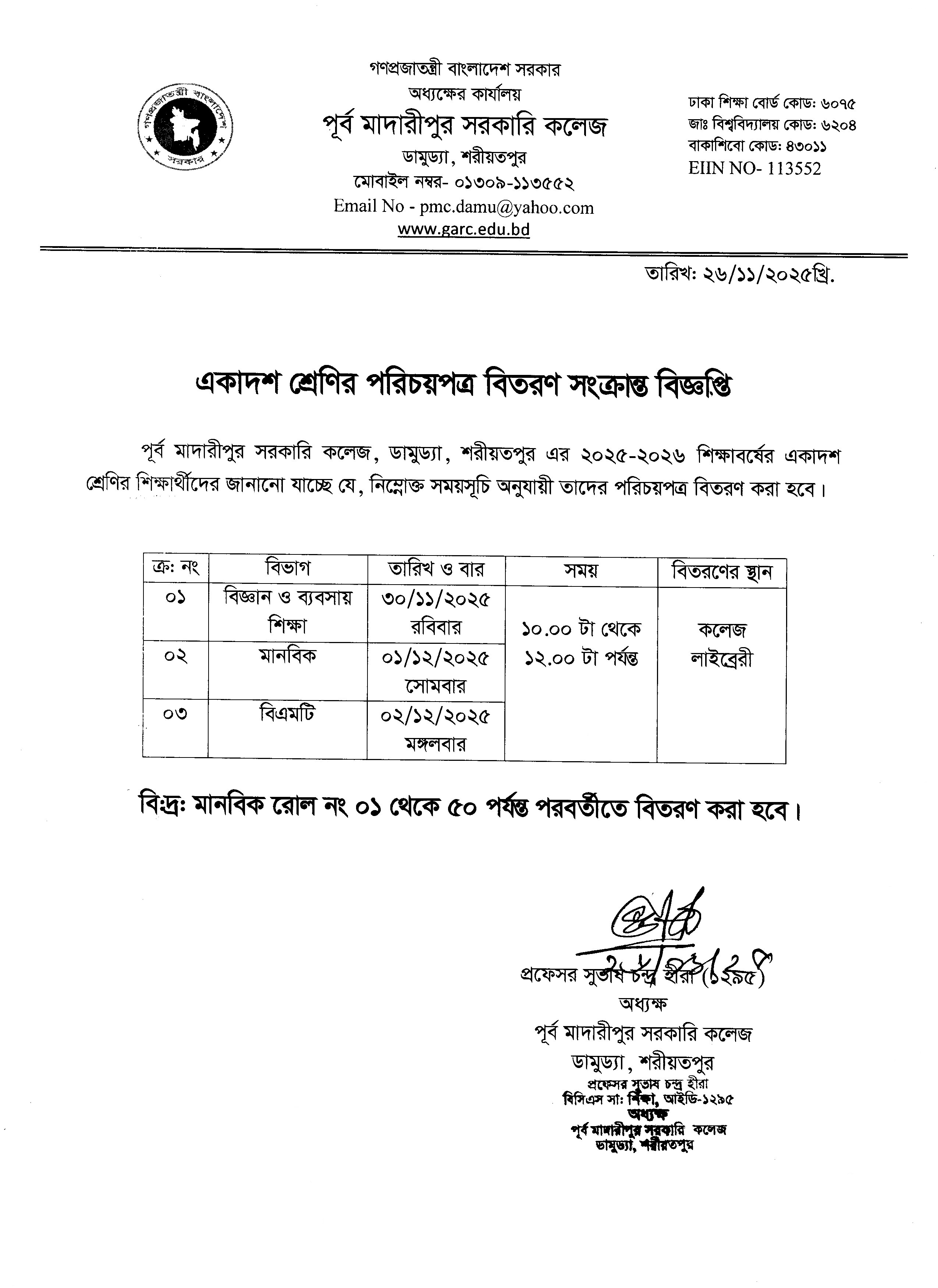 একাদশ শ্রেণির পরিচয়পত্র বিতরণ সংক্রান্ত বিজ্ঞপ্তি.....