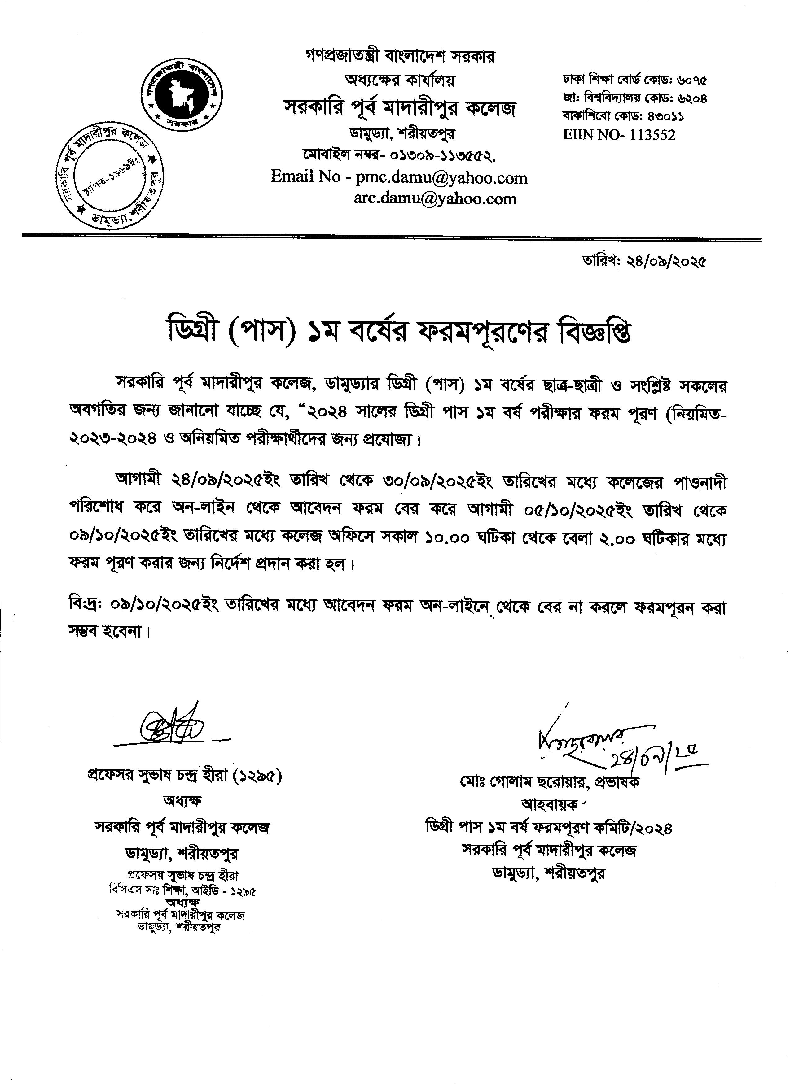 স্নাতক (পাস) ১ম বর্ষ ফরমপূরণ সংক্রান্ত বিজ্ঞপ্তি |